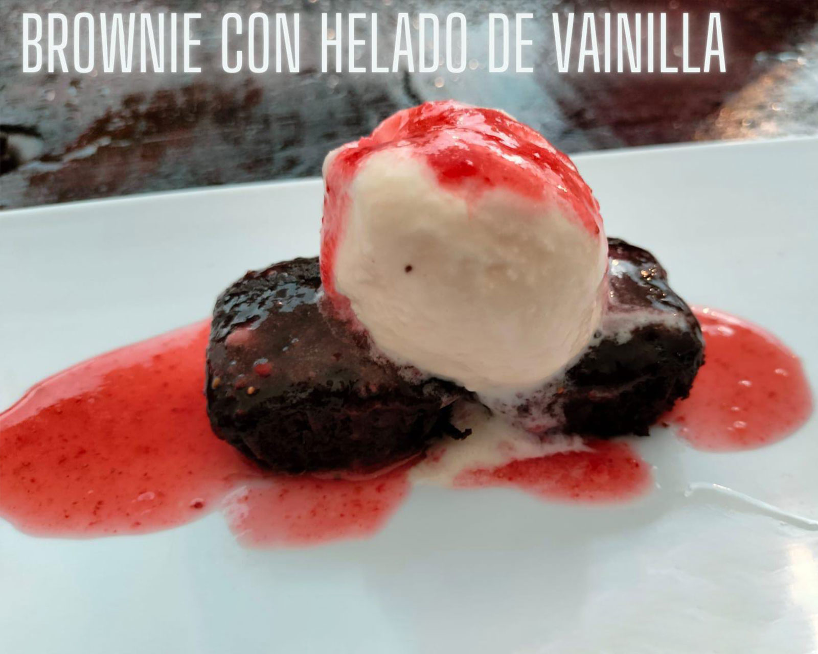 Brownie de la casa con helado de vainilla y salsa de fresa.