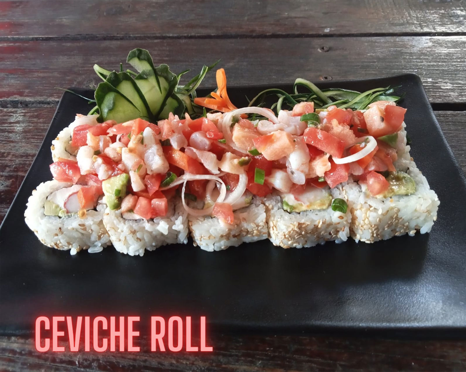 Cangrejo, aguacate y filadelfia por dentro, ceviche de salmón y camarón encima.