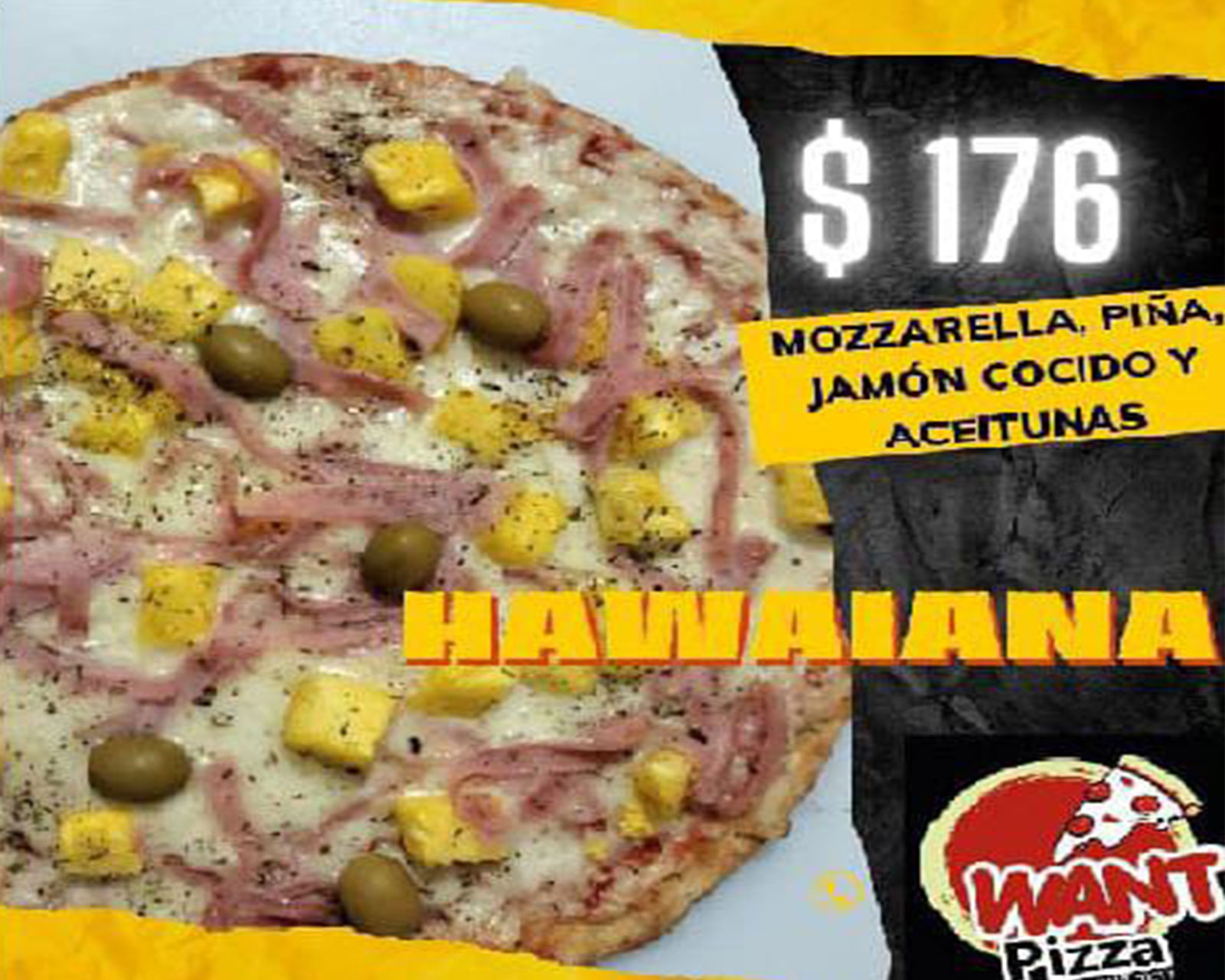 Mozzarela, piña, jamón cocido y aceitunas verdes $176.00