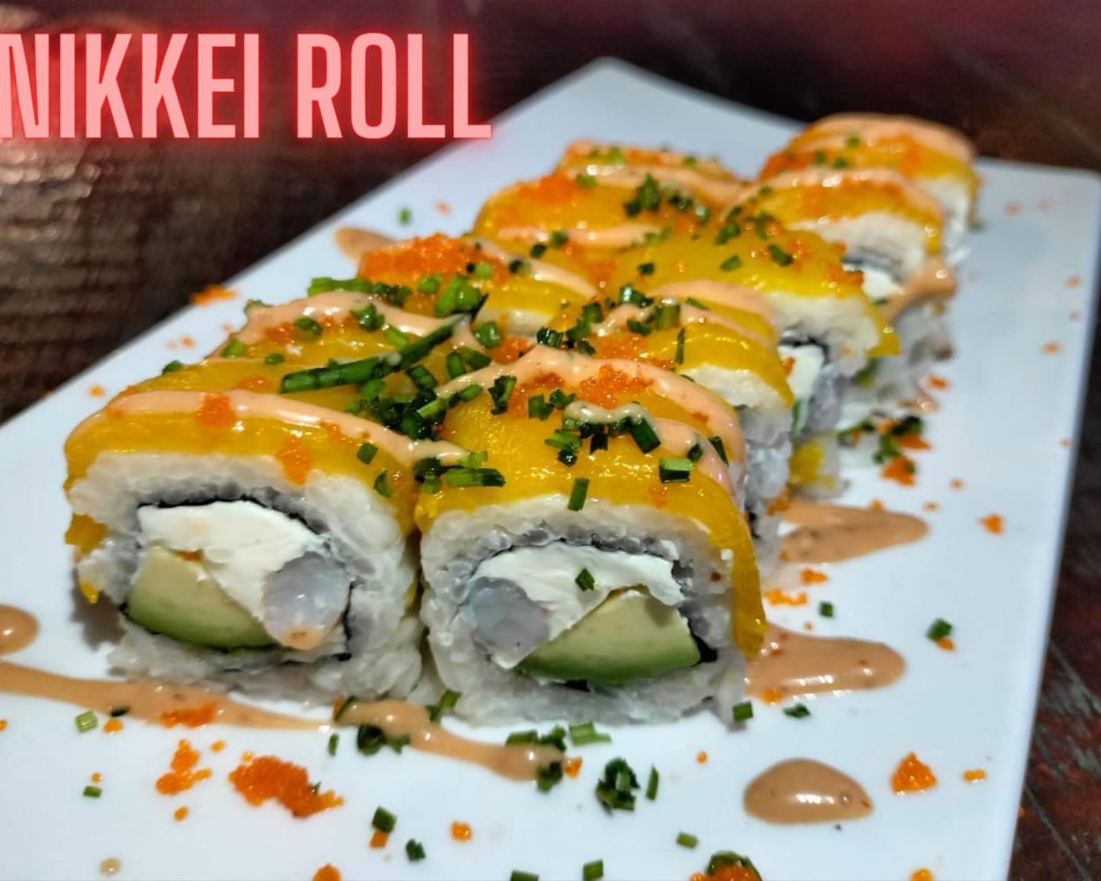 Camarón, aguacate y filadelfia por dentro, mango por fuera, cebollin, masago y chipotle encima.